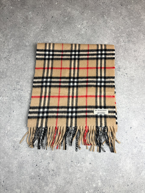 An iconic Burberry classic, crafted from soft cashmere and featuring the timeless Classic Check pattern in beige with black, white, and red accents.